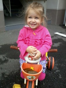 David and I were talking about getting one for her, perhaps for Christmas. But last week, a new friend (Maki), sent an email to me asking if I would like to take a tricycle that her girls no longer used. I excitedly wrote back, ‘yes!’ Today Maki brought the bike over.